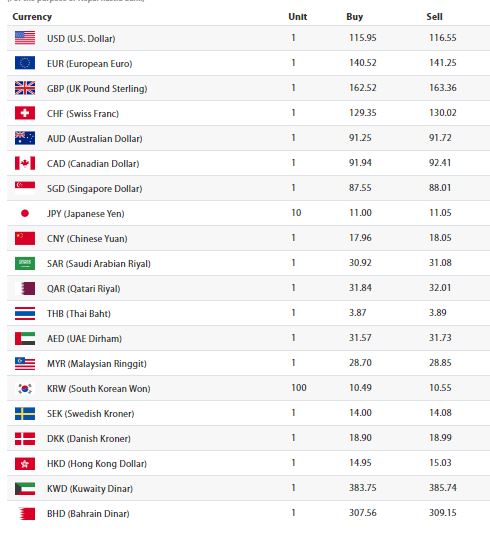 काठमाडौं । नेपाल राष्ट्र बैंकले आज सोमवारका लागि विदेशी मुद्राको विनिमयदर सार्वजनिक गरेको छ । सार्वजनिक दरअनुसार आज अमेरिकी डलर एकको खरिददर ११५ रुपैयाँ ९५ पैसा र बिक्रीदर ११६ रुपैयाँ ५५ पैसा कायम भएको छ ।