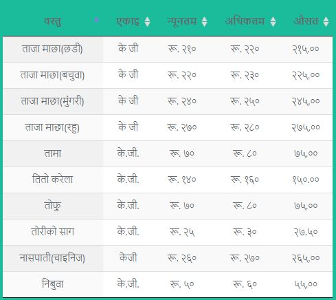 यसैगरी रातो आलु केजीको २७ रुपैयाँ, भारतीय रातो आलु २५ रुपैयाँ, तराई काउली २२.५० रुपैयाँ, स्थानीय काउली ३० रुपैयाँ, कागती प्रतिकेजी १४० रुपैयाँ, केरा प्रतिदर्जन १०५ रुपैयाँ कायम भइ कारोबार भइरहेको समितिले जनाएको छ ।