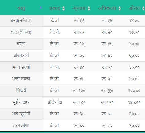 समितिले सुकेको खुर्सानी प्रतिकेजी ३२५ रुपैयाँ, हरियो खुर्सानी ८५ रुपैयाँ, गोलभेँडा ठूलो ४५ रुपैयाँ, गोलभेँडा सानो १२.५० रुपैयाँ, गोलभेँडा सानो (तराई) १७.५० रुपैयाँ तोकेको छ ।