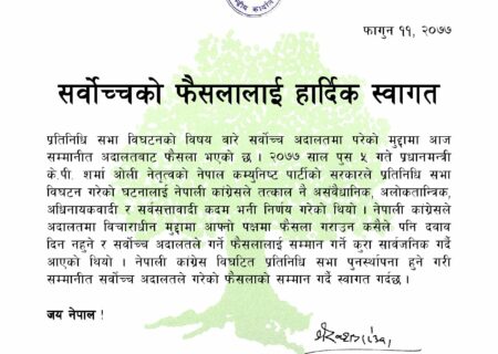 काठमाडौं । संसद पुनर्स्थापना गर्ने सर्वोच्च अदालतको निर्णयलाई नेपाली कांग्रेसले स्वागत गरेको छ ।