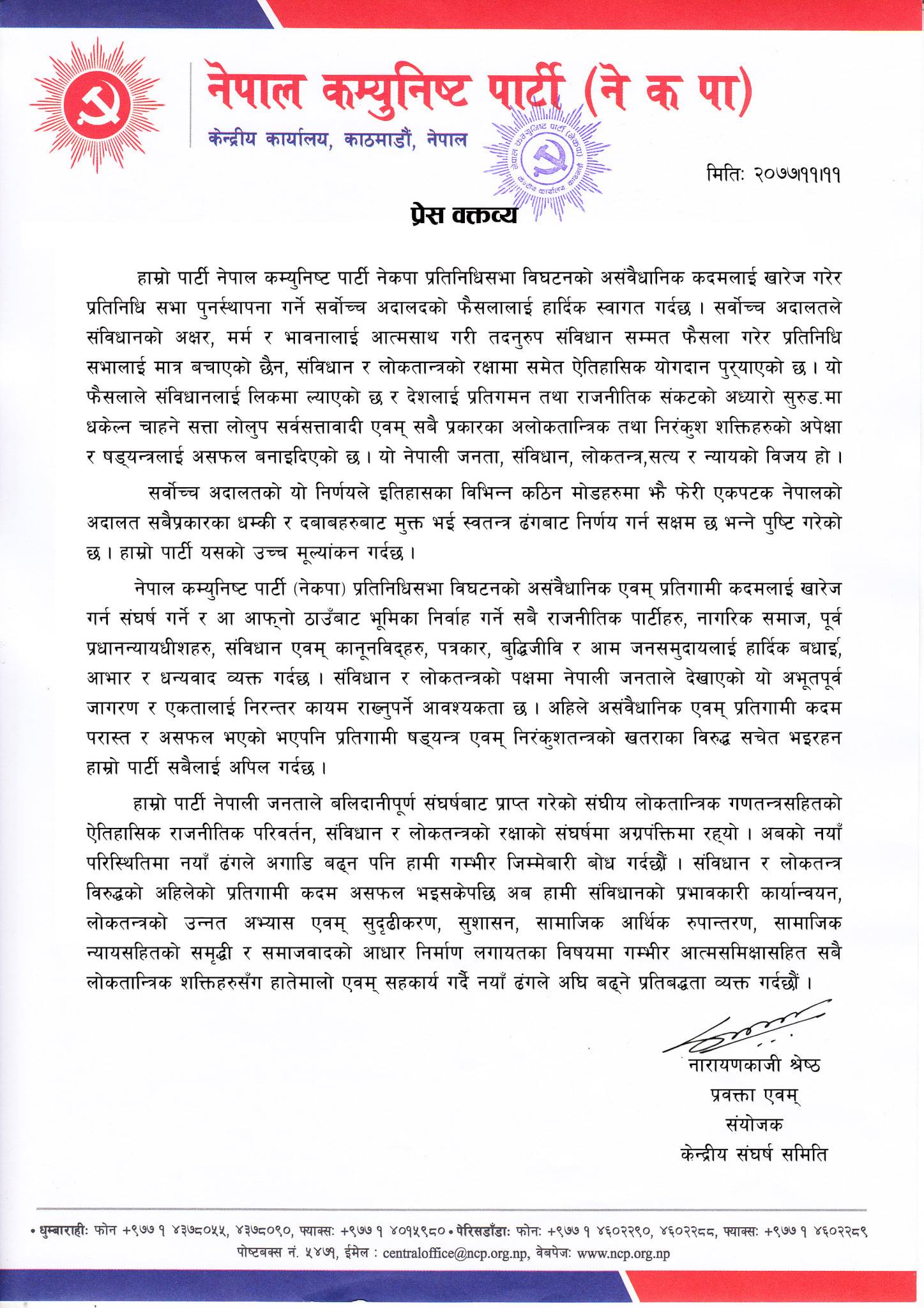 नेकपा प्रचण्ड–नेपाल समूहले अबको नयाँ परिस्थितिमा गम्भीर जिम्मेवारी बोध गर्दै नयाँ ढंगले अगाडि बढ्ने बताएको छ । सो समूहका प्रवक्ता नारायणकाजी श्रेष्ठले सर्वोच्च अदालतले मंगलबार प्रतिनिधिसभा पुनःस्थापना गरेपछि एक विज्ञप्ति जारी गर्दै संविधानको प्रभावकारी कार्यान्वयन, लोकतन्त्रको उन्नत अभ्यास एवमु सुदृढीकरण, सुशासन, सामाजिक आर्थिक रुपान्तरण, सामाजिक न्यासहितको समृछि र समाजवादको आधार निर्माणलगायतका विषयमा गम्भीर आत्मसमीक्षासहित सबै लोकतान्त्रिक शक्तिहरुसँग हातेमालो गर्दै नयाँ ढंगले अघि बढ्ने प्रतिवद्धता व्यक्त गरेका हुन् ।