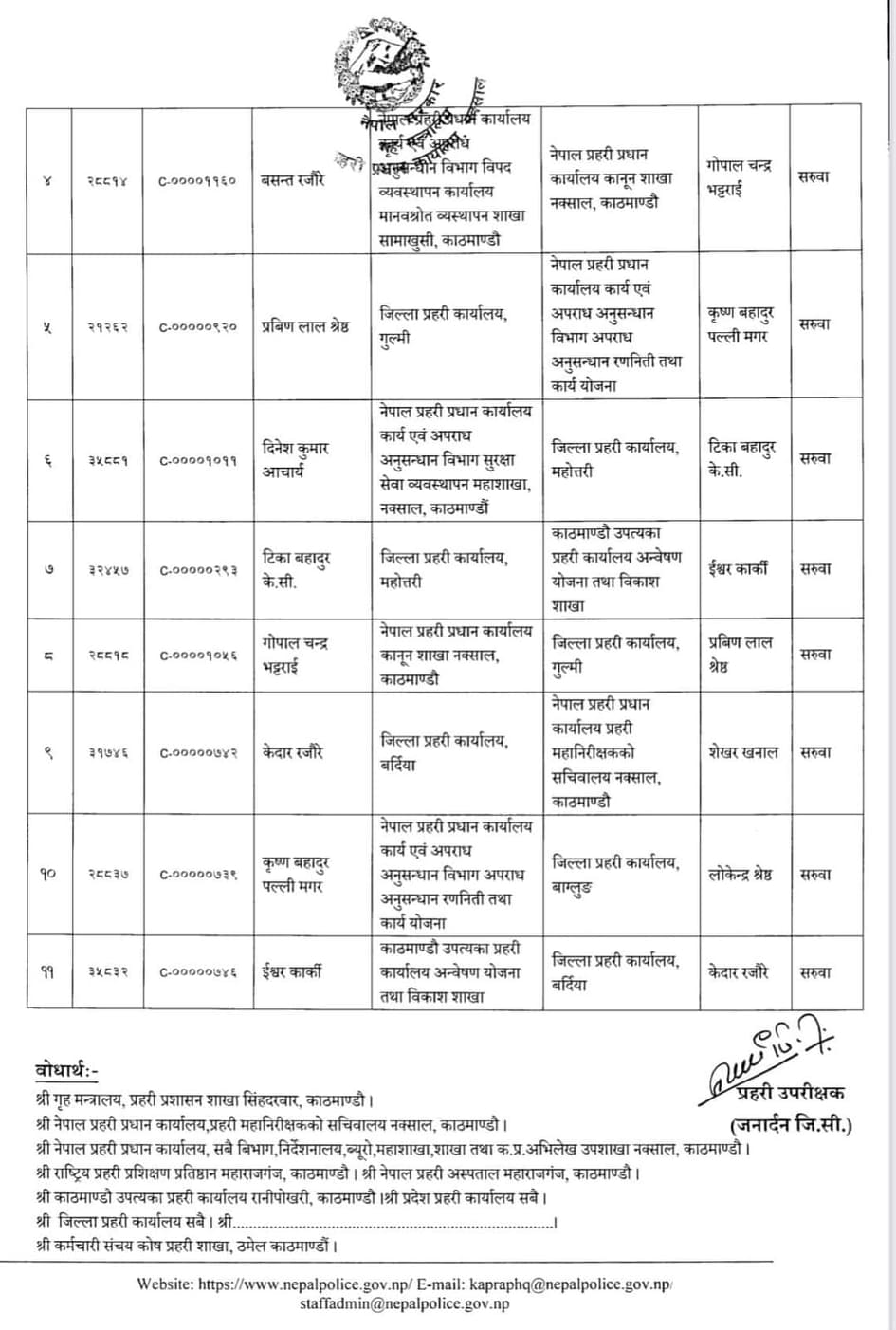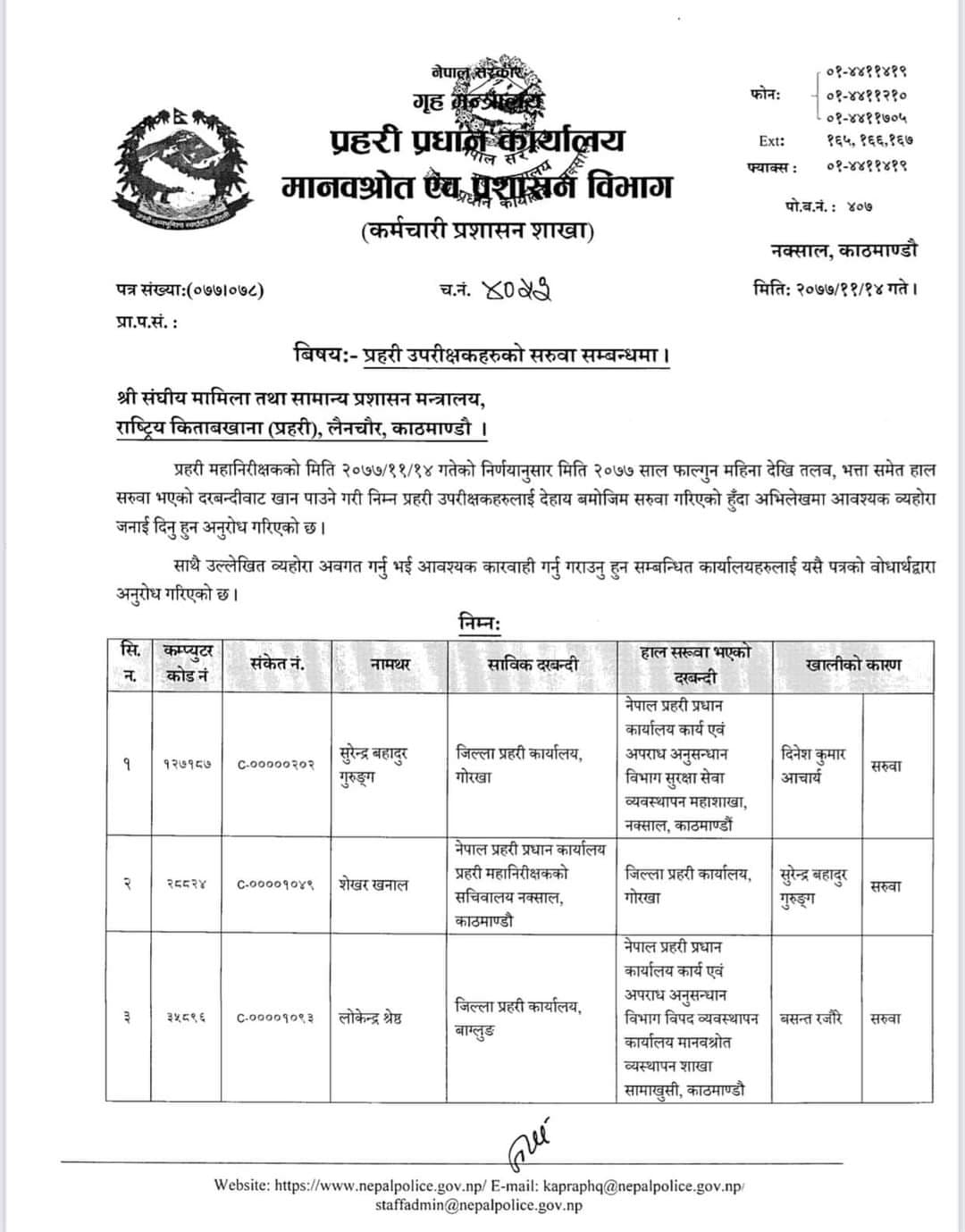 गोरखामा शेखर खनाल, गुल्मी गोपालचन्द्र भट्टराई, बाग्लुङमा कृष्णबहादुर पल्ली मगर, महोत्तरीमा दिनेश कुमार आचार्य र बर्दियाको प्रहरी प्रमुुखमा ईश्वर कार्कीलाई सरुवा गरिएको हो । प्रहरी प्रधान कार्यालयका अनुसार उनीहरु सबैको सरुवा फागुन महिनाभित्रै लागू हुने गरी भएको हो ।