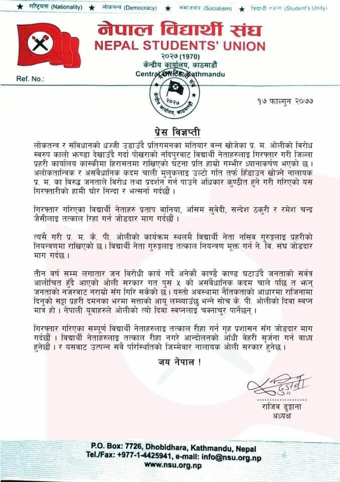 नेविसंघले सोमवार एक विज्ञप्ति जारी गर्दै पक्राउ परेका विद्यार्थी नेताहरुलाई तत्काल रिहाइको माग गरेको छ ।