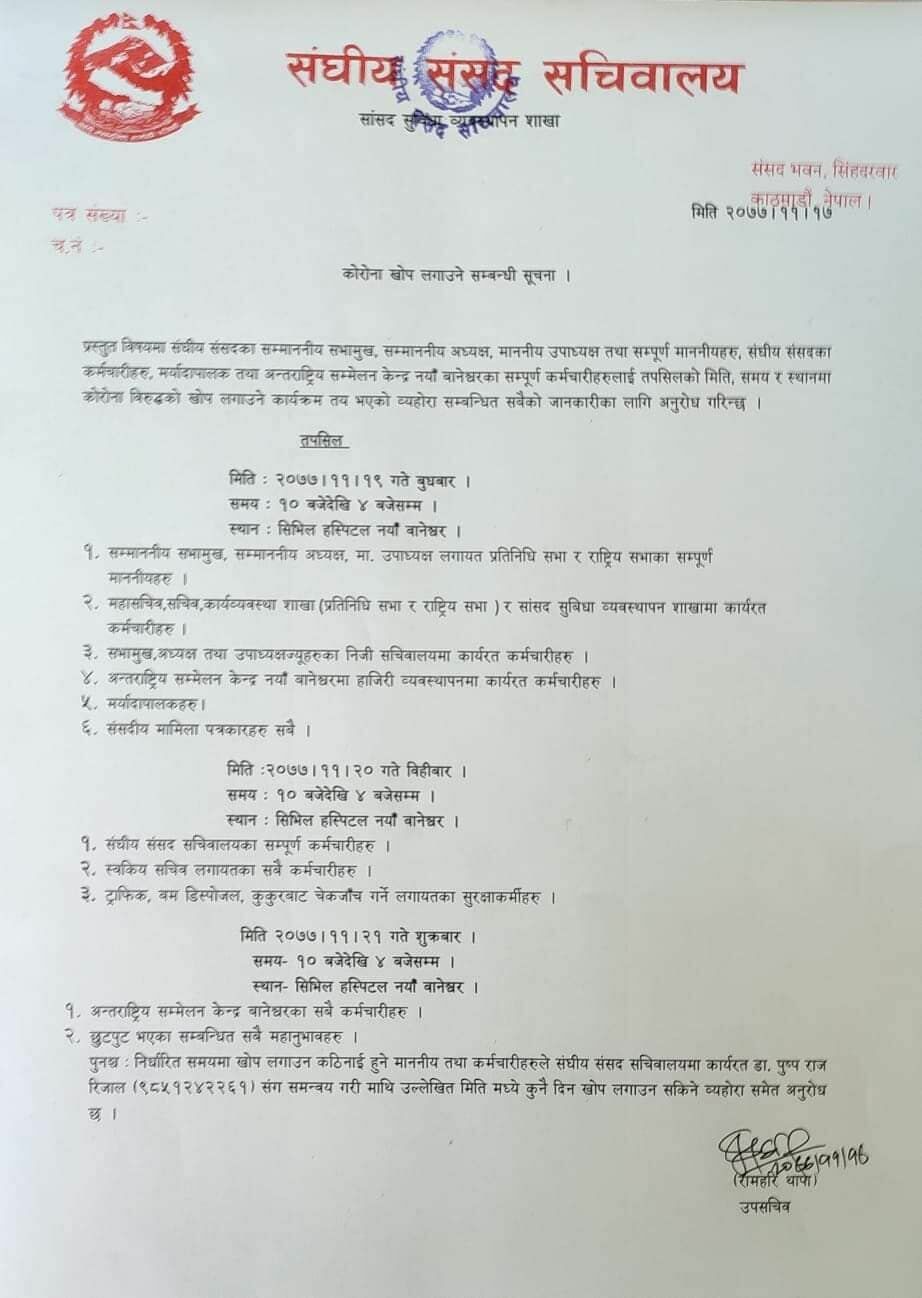 राष्ट्रिय सभा, प्रतिनिधि सभा र संसद भवनमा कार्यरत सम्पूर्ण कर्मचारीहरुले बैठकमा प्रवेश गर्न अनिर्वायरुपमा खोप लगाउनुपर्ने संघीय संसद सचिवालयले जनाएको हो । फागुन १९ गतेदेखि २१ गतेसम्म बिहान १० बजेदेखि ४ बजेसम्म खोप लगाउन निजामती सेवा अस्पतालमा व्यवस्था मिलाएको छ ।
