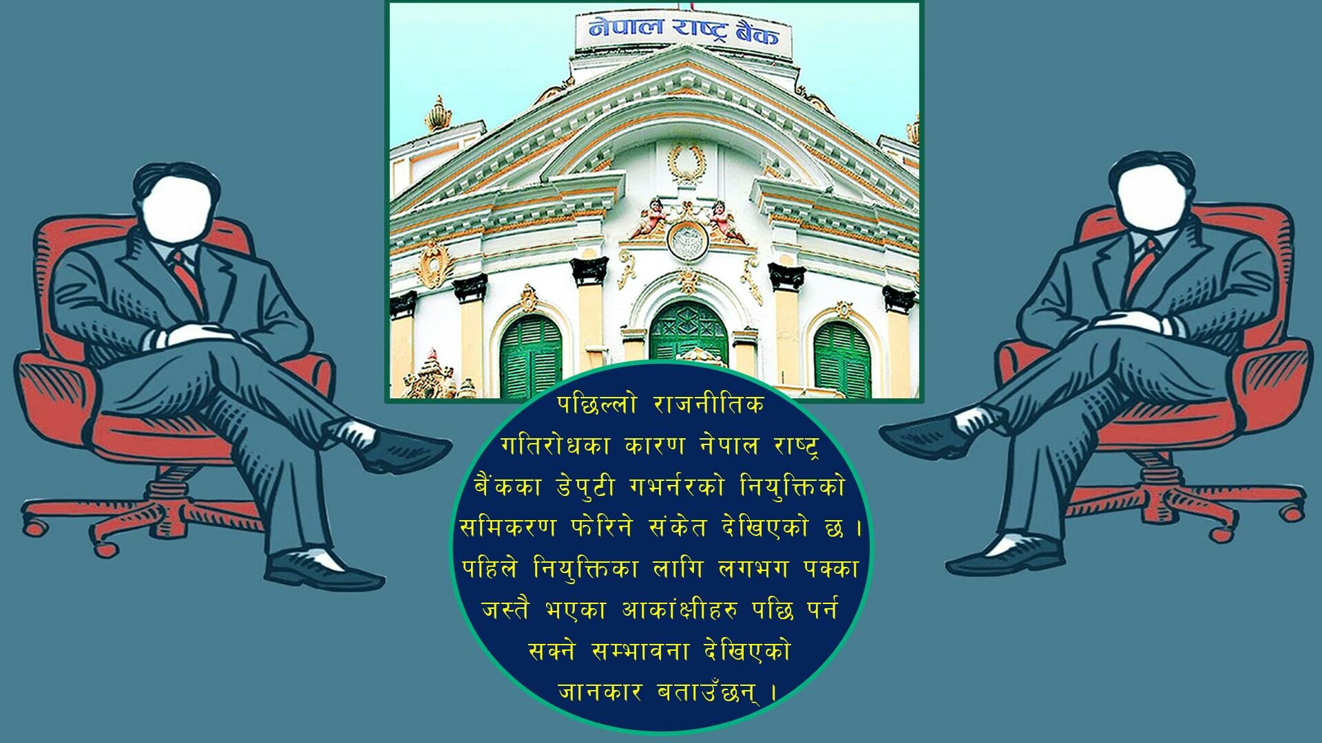 गभर्नर महाप्रसाद अधिकारीले यसै साता सिफारिस गर्ने र यसै साता बस्ने मन्त्रिपरिषद्ले नयाँ डेपुटी गभर्नर नियुक्ति गर्ने सम्भावना रहेको बताइएको छ । संसद पुनर्स्थापनापछि राजनीतिक माहोल परिवर्तन भएको छ । नैतिकताका आधारमा प्रधानमन्त्री ओलीले राजिनामा दिनुपर्ने माग आइरहेकाले राजीनामा दिने बित्तिकै मन्त्रीमण्डल सबै हेरफेर हुन्छ । त्यसले प्रभावित बनाउन सक्ने भन्दै सरकारले जतिसक्यो उति छिटो डेपुटी गभर्नर नियुक्ति गर्ने कसरत गरिरहेको स्रोत बताउँछ ।