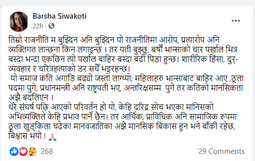 यो परिवर्तन आउन धेरै संघर्ष गर्नु परेको भन्दै शिवाकोटीले केहि दरिद्र सोच भएका मानिसको अभिव्यक्तिले केहि प्रभाव नपार्ने टिप्पणी गरेकी छिन् । आर्थिक, प्राविधिक र सामाजिक रुपमा ठूला खुड्किला चढेका मानवजातिको मानसिक विकास भइनसकेको भन्दै उनले दुख व्यक्त गरेकी छिन् ।