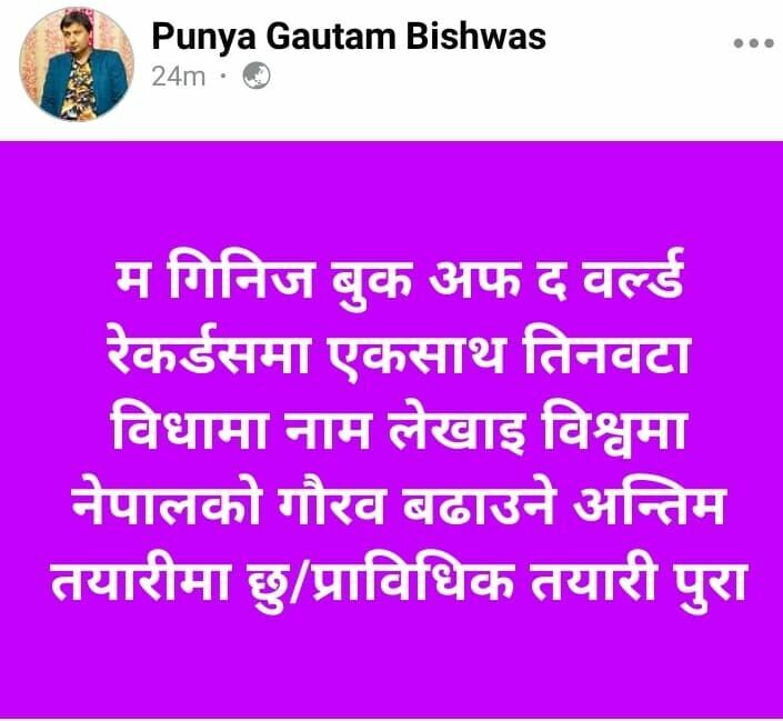 काठमाडौं । समाजिक अभियान्ता पुण्य गौतमले ‘गिनिज बुक अफ द वर्ल्ड रेकर्ड’मा नाम लेखाउने तयारी गरेका छन् । उनले आफू ‘गिनिज बुकमा वर्ल्ड रेकर्ड’ राख्ने तयारीमा रहेको बताएका छन् ।