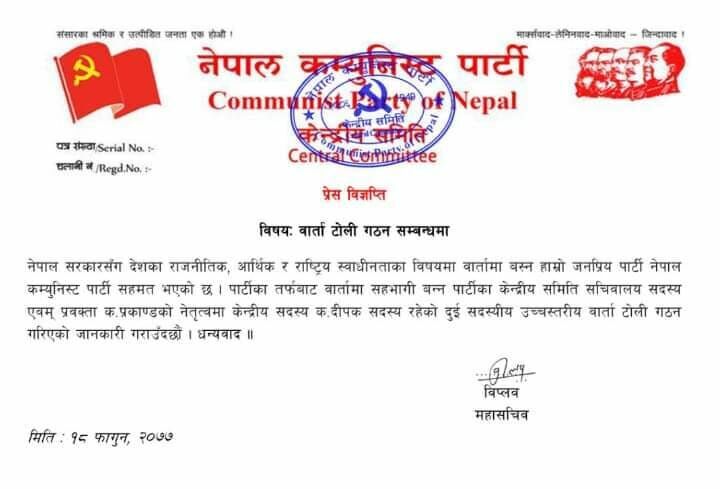 वार्ता टोलीमा प्रवक्ता प्रकाण्ड सहित दीपक चलाउने रहेका पार्टीका महासचिव नेत्र विक्रम चन्द ‘विप्लव’ले जारी गरेको विज्ञप्तीमा जनाइएको छ । सरकारसँग वार्ताका लागि विप्लव समूहले केही दिनअघि नै टोली गठन गरेको जनाइएको छ ।