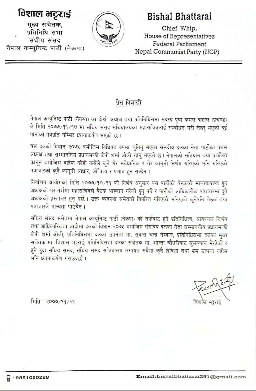 आज (शुक्रबार) एक विज्ञप्ति जारी गर्दै प्रधानमन्त्री केपी शर्मा ओलीले संसदीय दलको नेताका रुपमा गरेको कार्य मान्य नहुने भनी गरेको पत्राचारलाई गैरसंवैधानिक र गैरकानूनी निर्णय भनेका छन् । हेर्नुहोस् विज्ञप्ती :