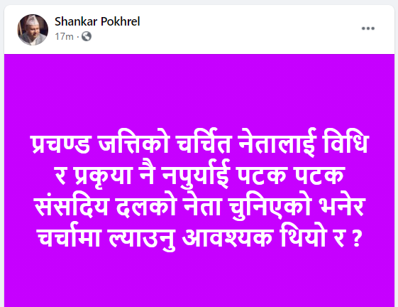सामाजिक सञ्जाल फेसबुकमा लेख्दै मुख्यमन्त्री पोखरेलले प्रचण्ड चर्चित भएको र पटक पटक विधि विधि र प्रकृया नै नपुर्याई संसदीय दलको नेता बनाइएको आरोप लगाए ।
