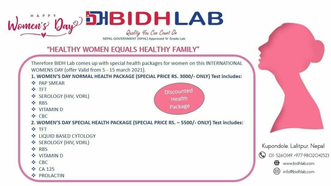 काठमाडौं । नेपाल सरकारबाट ‘ए’ ग्रेडको परीक्षण ल्याबको मान्यता पाइसकेको विध ल्याबले अन्तर्राष्ट्रिय नारी दिवसको अवसरमा सम्पूर्ण परीक्षणमा विशेष छुट दिने भएको छ । स्वस्थ महिला, स्वस्थ परिवार नाराका साथ ल्याबले आफ्ना सेवाहरुमा मार्च ५ देखि १५ सम्म विशेष छुटको व्यवस्था गरेको विध ल्याबले जनाएको छ ।