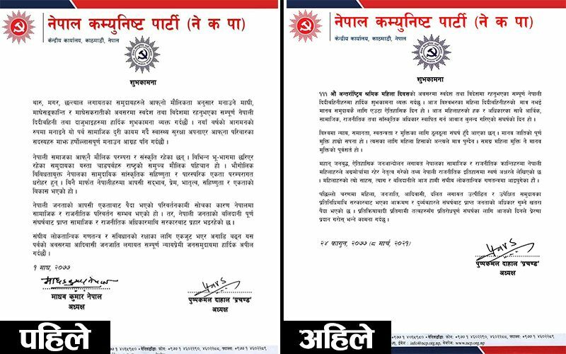 त्यसो त विभिन्न उपलक्ष्यमा नेपाल कम्युनिष्ट पार्टी (नेकपा) को नामबाट आउने हरेक विज्ञप्तिमा दुवै अध्यक्षको नाम र हस्ताक्षर हुने गर्दथ्यो । तर, सोमवार १११ औँ अन्तर्राष्ट्रिय नारी दिवसको अवसरमा नेकपाको ‘लेटरप्याड’बाट जारी विज्ञप्तिमा माधवकुमार नेपालको नाम छैन । एकल अध्यक्षको रुपमा प्रचण्डको नाम र हस्ताक्षर रहेको छ । जसको विभिन्न कोणबाट टिका टिप्पणी भइरहेको छ ।