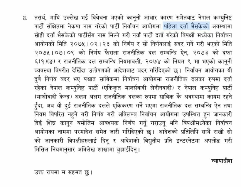 ‘माथि उल्लेख भइ विवेचना भएको कानूनी आधार काराण समेतबाट नेपाल कम्युनिस्ट पार्टी संक्षिप्तमा नेकपा नाम गरेको पार्टी निर्वाचन आयोगमा पहिला दर्ता भइसकेको आवस्थामा सोही दर्ता भइसकेको पार्टीसँग नाम मिल्ने गरी नयाँ पार्टी दर्ता गरेको विपक्षी मध्येका निर्वाचन आयोगको मिति २०७५–०२–२३ को निर्णय र सो निर्णयलाई सदर गर्ने गरी भएको मिति २०७५–०७–०९ को निर्णय फैसला राजनीतिक दल सम्बन्धि ऐन, २०७३ को दफा ६९१० (ङ) र राजनीतिक दल सम्बन्धी नियमावली, २०७४ को नियम ९ मा भएको कानूनी व्यवस्था विपरीत देखिँदा उत्प्रेषणको आदेशबाट बदर गरिदिएको छ ।’ सर्वोच्चको फैसलामा भनिएको छ ।