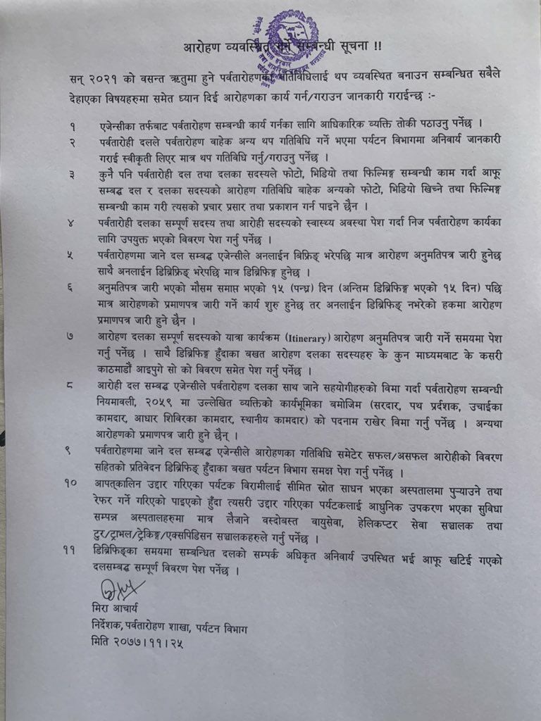 आरोहण एजेन्सीका तर्फबाट पर्वतारोहणसम्बन्धी काम गर्नका लागि आधिकारिक व्यक्ति तोकेर पठाउनुपर्नेछ, पर्वतारोहणबाहेक अन्य गतिविधि गर्नुपर्ने भएमा विभागको अनुमति लिनुपर्नेछ, पर्वतारोहणमा जाने दल सम्बद्ध एजेन्सीले अनलाइन ब्रिफिङ भरेपछि मात्रै अनुमति पाउनेछन्, अनलाइन ब्रिफिङ भरेपछि मात्रै बल्ल डिब्रिफिङ प्राप्त हुने विभागले जनाएको छ ।