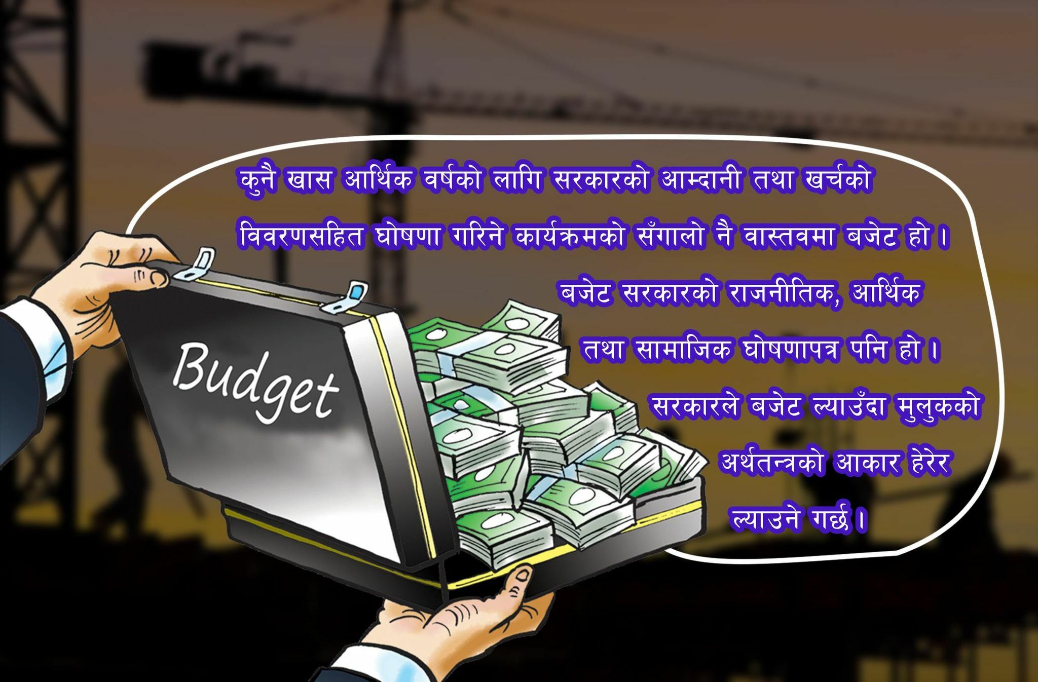 काठमाडौं । सामान्य अर्थमा सरकारको आय र व्ययको दस्तावेज नै बजेट हो । बजेटले आम्दानी कति र कसरी गर्ने तथा कुन कुन शिर्षकमा कति कति खर्च गर्ने भन्ने कुराको निर्क्यौल गर्छ । बजेट संवैधानिक तथा राजनैतिक दस्तावेज पनि हो । जसमा नीति तथा आयव्ययको कुराहरु पनि उल्लेख गरिएको हुन्छ । त्यस्तै, कुनै खास आर्थिक वर्षको लागि सरकारको आम्दानी तथा खर्चको विवरण सहित घोषणा गरिने कार्यक्रमको सँगालो नै वास्तवमा बजेट हो ।