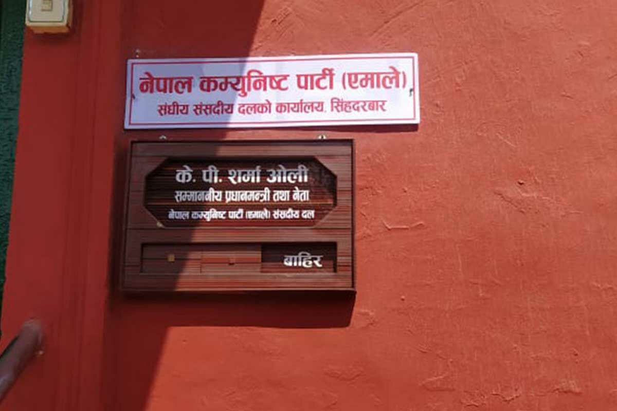 निर्वाचन आयोगले संघीय संसद सचिवालयलाई एमाले र माओवादी केन्द्र अलग भइसकेको पत्र पठाएसँगै नेकपा एमालेको साइनबोर्ड राखिएको हो । संसदीय दलको नेता एवम् प्रधानमन्त्री केपी शर्मा ओलीको कार्यकक्षको नेम प्लेटमा पनि नेकपा हटाएर नेकपा एमाले लेखिएको छ।