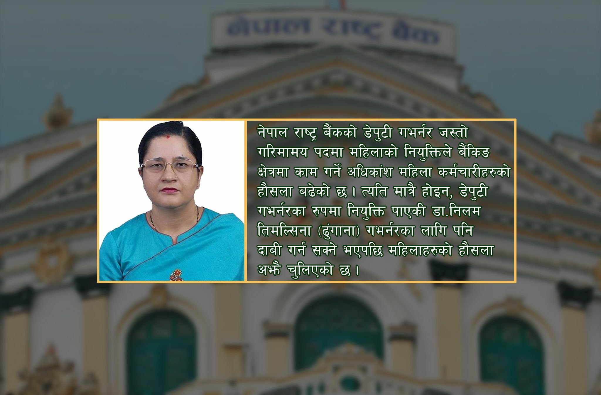 मंगलवार (हिजो) मन्त्रिपरिषद्को बैठकले राष्ट्र बैंकका कार्यकारी निर्देशकद्वय निलम तिमल्सिना (ढुंगाना) र बमबहादुर मिश्रलाई डेपुटी गभर्नरमा नियु्क्त गरेपछि ढुंगानाले एउटा छुट्टै इतिहास रचेकी छन् । उनी खुसी हुँदै सरकारले आफ्नो कामको कदर गरेको प्रतिक्रिया दिएकी छिन् । उनी नेपालको इतिहासमा राष्ट्र बैंककै एक सशक्त र प्रभावशाली महिला कार्यकारी निर्देशक हुन् । जो प्रगतिपथमा लम्किरहेकी छिन् । डेपुटी गभर्नरका रुपमा ढुंगानाको नियुक्तिले एकातिर सरकारले माथिल्ला तहहरुमा महिलालाई समावेश गरेको चर्चा छ भने अर्कातिर ढुंगाना बैंकिङ क्षेत्रमा आवद्ध सम्पूर्ण महिला कर्मचारीहरुलाई एक आदर्श र हौसलाका रुपमा देखिएकी छिन् । नेपालको इतिहासमा अहिलेसम्म राष्ट्र बैंकमा कार्यरत कुनै पनि महिला कार्यकारी निर्देशक डेपुटी गभर्नरमा नियुक्ति भएका थिएनन् । यसअघि सरिता भट्ट अधिकारी कार्यकारी निर्देशकबाट सेवानिवृत भएकी थिइन् । उनी ३० वर्षे अवकाश नीतिका कारण सेवानिवृत भएकी थिइन् । यदि अधिकारी हालसम्म पनि कार्यरत भएको भए सायद उनी पनि डेपुटी गभर्नरका लागि दाबेदार मानिन्थिन् ।