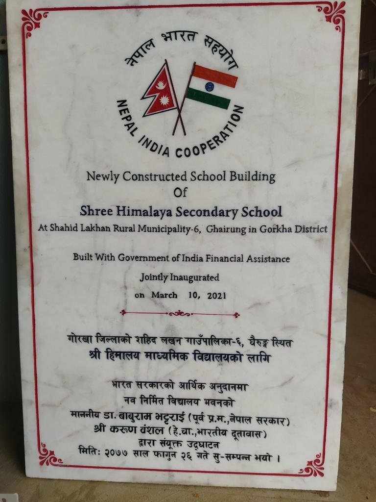 निर्माण सम्पन्नसँगै हिमालय माध्यमिक विद्यालयको नयाँ भवनको भारतीय राजदूतावासका प्रशासन प्रमुख करुण वंशल, जिल्ला समन्वय समिति, गोरखा, विद्यालय व्यवस्थापन समिति तथा स्थानीय प्रतिनिधिहरुबाट संयुक्त रुपमा उद्घाटन भएको हो ।