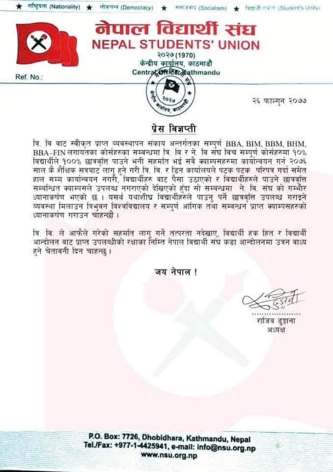 काठमाडौं । नेपाल विद्यार्थी संघ (नेविसंघ)ले त्रिभुवन विश्वविद्यालयबाट स्वीकृत प्राप्त व्यवस्थापन संकाय अन्तर्गतका विभिन्न कोर्सहरुमा विद्यार्थीहरुलाई दिने भनिएको छात्रवृद्धि उपलब्ध नराएको भन्दै आपत्ति जनाएको छ ।