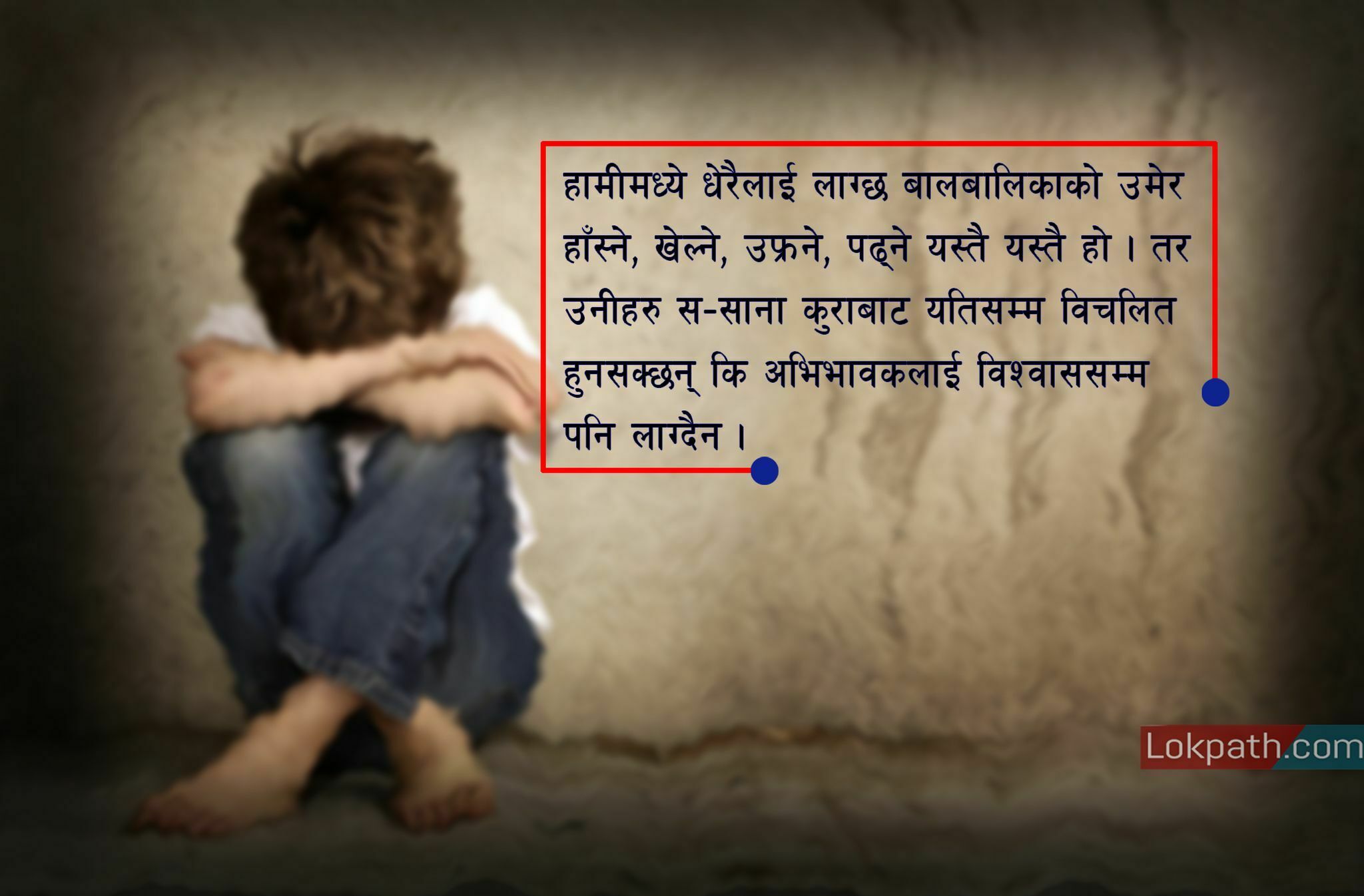 बेलाबेला व्यस्त जीवनबाट पट्यार लागेको अवस्थामा मानिसहरु आफ्नो बालापन सम्झिन्छन् । त्यस्तै निश्फिक्री जीवन जिउन पाए भन्दै विगतको यादमा रमाउँछन् । तर, बाल्यावस्थामै आफ्नो मृत्युको प्रपञ्च रच्न थालेका आजका बालबालिकालाई हेरेर के बुझ्ने ? के बाल्यावस्थाको अबोधपन धमिलिएकै हो त ? यदि हो भने उनीहरुलाई यस्तो अवस्थासम्म केले र कसरी पु¥याउँछ ? जीवनसँग झन् धेरै प्रेममा पर्ने उमेरमा बालबालिकाहरु मृत्यु रोज्ने अवस्थासम्म आखिर कसरी पुग्छन् ?