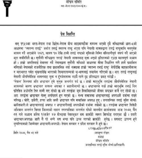मोर्चाका अध्यक्ष जयकृष्ण गोइतको हस्ताक्षर भएको उक्त विज्ञप्तिमा नेपाली औपनिवेशिक शाशकबाट उन्मुक्ति नहुन्जेल लडिरहने प्रतिबद्धता पनि गरेको छ।