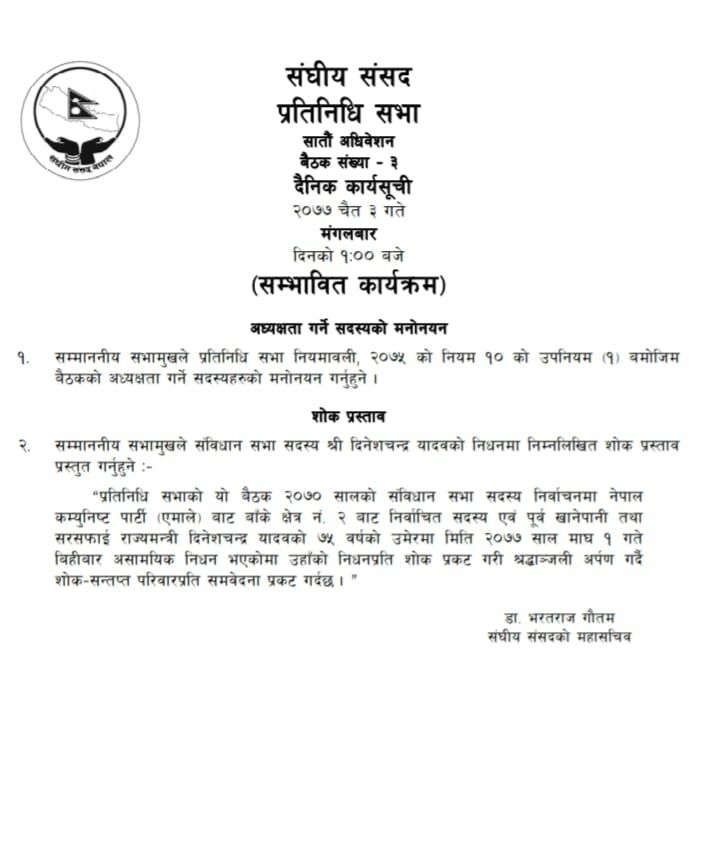 बैठकका लागि कार्यव्यवस्था परामर्श समितिको बैठकले सम्भावित कार्यसूची तय गरेको छ । तत्कालीन संविधान सभाका सदस्य दिनेशचन्द्र यादवको मृत्यु भएकोमा शोक प्रस्ताव पारित गर्ने सम्भावित कार्यसूची छ। आजको बैठकमा सभामुख उपस्थित नभएका बेला सभाको अध्यक्षता गर्ने प्यानलमा रहने सांसदहरूको मनोनयन गर्ने सम्भावित कार्यसूची पनि रहेको छ।