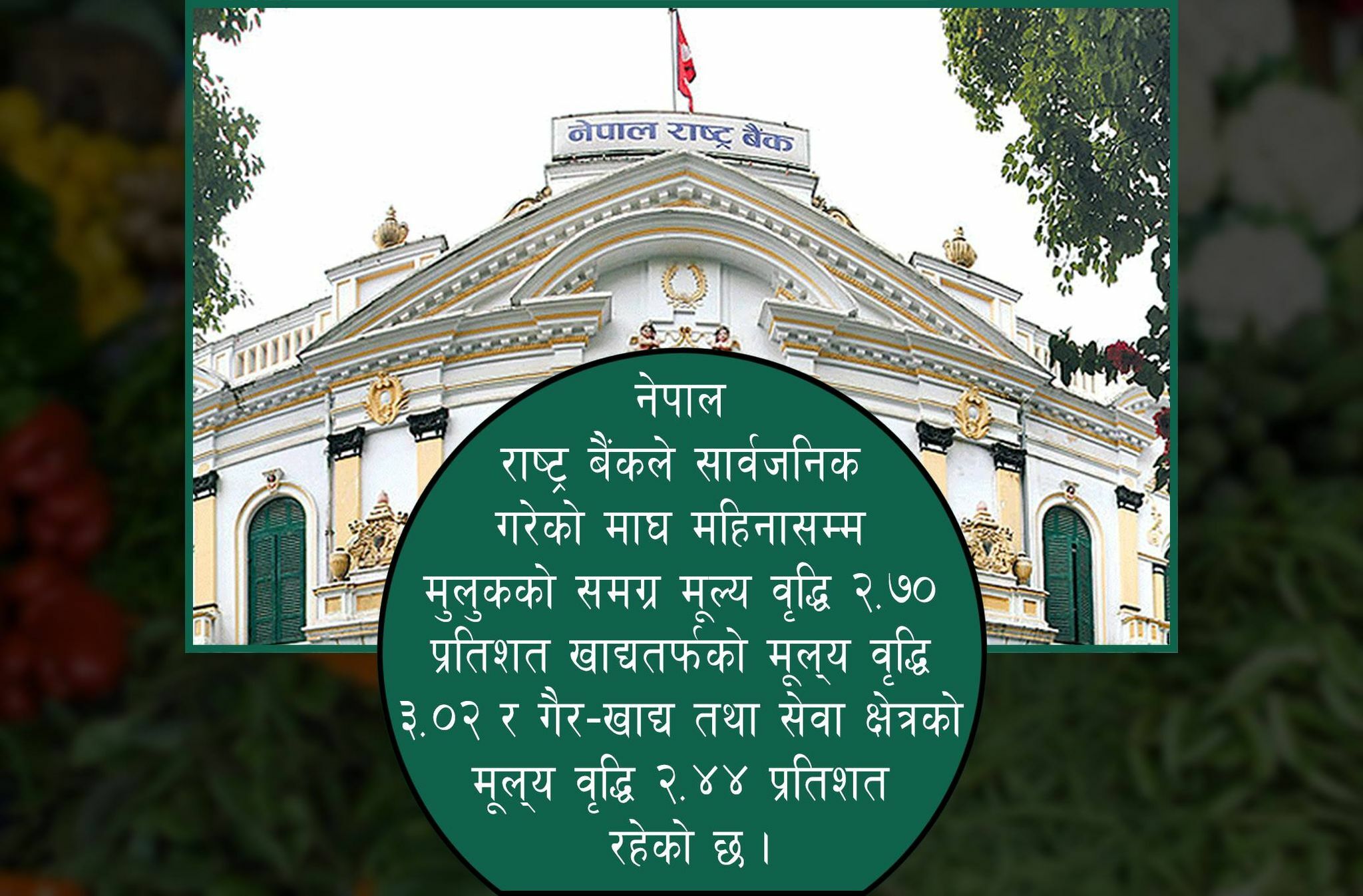 राष्ट्र बैंकका अनुसार माघमा वार्षिक बिन्दुगत उपभोक्ता मुद्रास्फीति २७० प्रतिशत रहेको छ । अघिल्लो वर्षको सोही महिनामा यस्तो मुद्रास्फीति ६.८७ प्रतिशत रहेको थियो ।