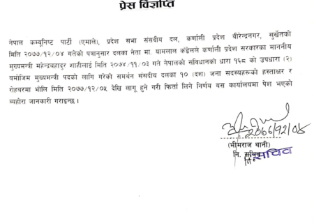 एमाले प्रदेश इञ्चार्ज यमलाल कँडेल सहित १० जना सांसदहरुले संयुक्त हस्ताक्षर गर्दै सरकारलाई दिएको समर्थन फिर्ता लिने र संसद सचिवालयलाई जानकारी गराउने निर्णय समेत गरिएको छ ।