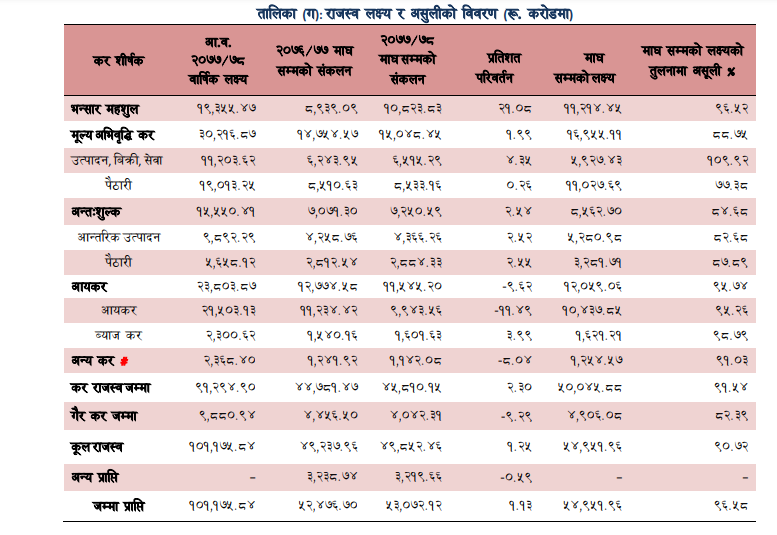 चालु आर्थिक वर्षको माघसम्ममा गत आर्थिक वर्षको सोही अवधीको तुलनामा भन्सार महशलुमा २१.१ प्रतिशतले वृद्धि भएको छ भने आयकरको संकलनमा ९.६ प्रतिशतले कमी आएको छ ।