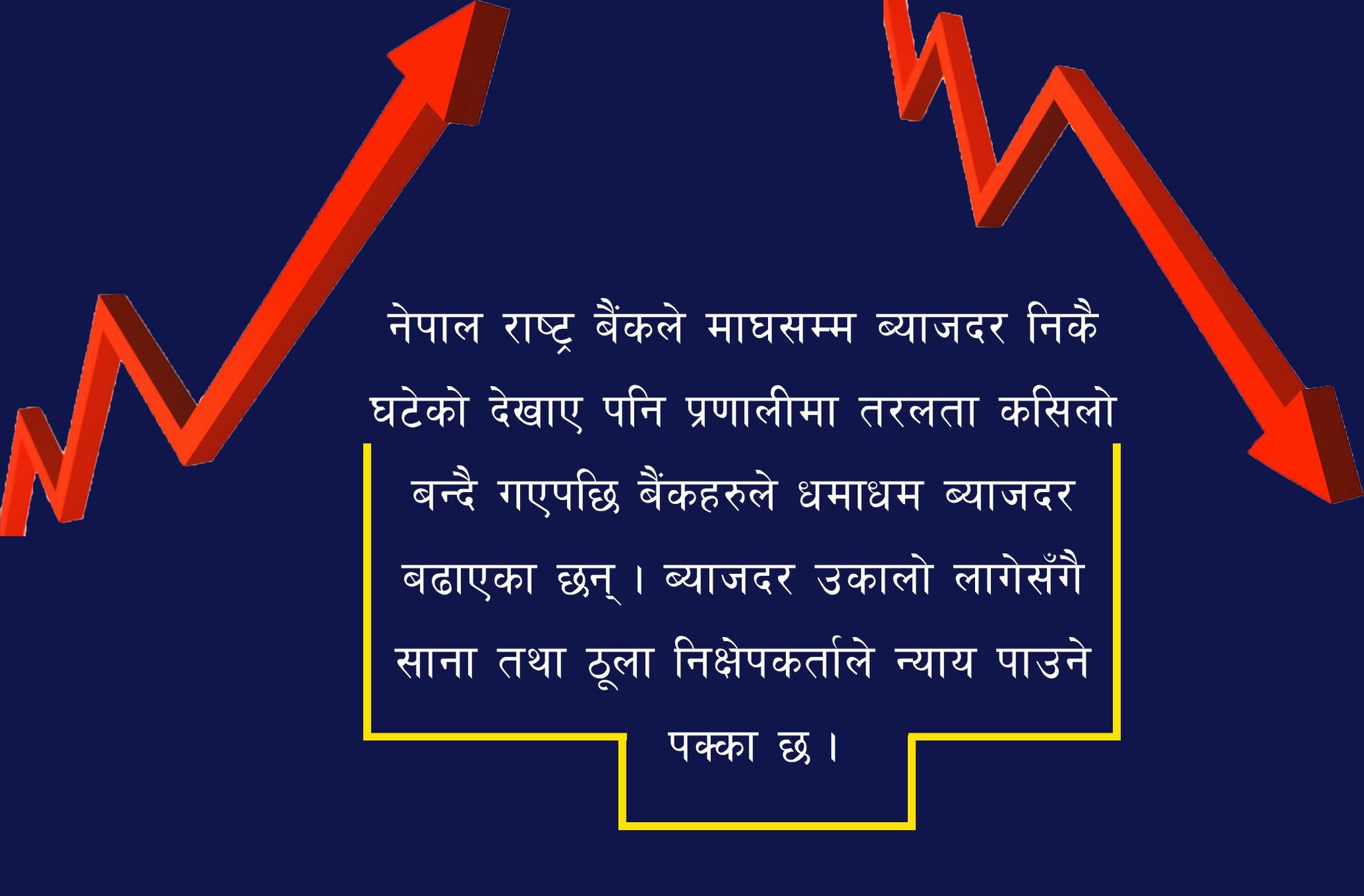 एकातिर राष्ट्र बैंकले ब्याजदर घटेको देखाएको छ । अर्कातिर अहिले प्रणालीमा तरलता कम हुँदा बैंकहरुले ब्याजदर बढाइरहेका छन् । केही वाणिज्य बैंकहरुले चैत १ (आइतबार) देखि लागू हुने गरी नयाँ ब्याजदर सार्वजनिक गरिसकेका छन् भने कतिपय बैंकहरु ब्याजदर सार्वजनिक गर्ने तयारीमा छन् । प्रणालीमा तरलता कम हुन थालेपछि बैंकहरुले आकर्षक ब्याजदरमा निक्षेप तान्न थालेका हुन् । विगतका वर्षहरुमा पनि बैंकहरुले पुस-माघ ताका तरलता कम भएका बेला आकर्षक ब्याजकदरमा निक्षेप तानातान गर्थे । यस वर्ष पनि प्रणालीमा तरलता कम हुँदै गएपछि बैंकहरुले निक्षेप तान्न आकर्षक ब्याजदर सार्वजनिक गरिरहेका छन् ।