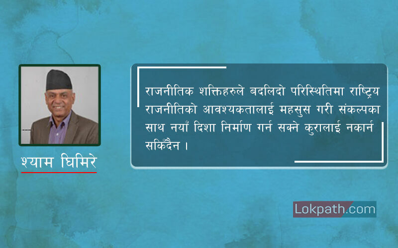 यस्तो अवस्थामा सबै राजनीतिक दलहरुले एक ठाँउमा बसेर राष्ट्रिय राजनीतिको गम्भिर समीक्षा गर्दै समस्या र त्यसको समाधानको पहिचान गर्न आवश्यक छ । वर्तमान प्रधानमन्त्रीको कदम अदालतवाट अस्वीकृत भैसकेको, उनको जनादेश प्राप्त पार्टीको बैधानिकता समाप्त भैसकेको र पार्टी भित्रकै गम्भिर अन्तरकलहका कारण उनले सत्ताको मार्गवाट हटेर नयाँ सरकार गठनको मार्ग प्रशस्त गर्ने, त्यसपछि दोश्रो ठूलो दल कांग्रेसको नेतृत्वमा त्यो पनि नभए जसका नाउँमा सहमति बन्न सक्छ उसैको नेतृत्वमा धारा ७६ को २ अनुसारको सरकार निर्माण गर्न सकिन्छ ।