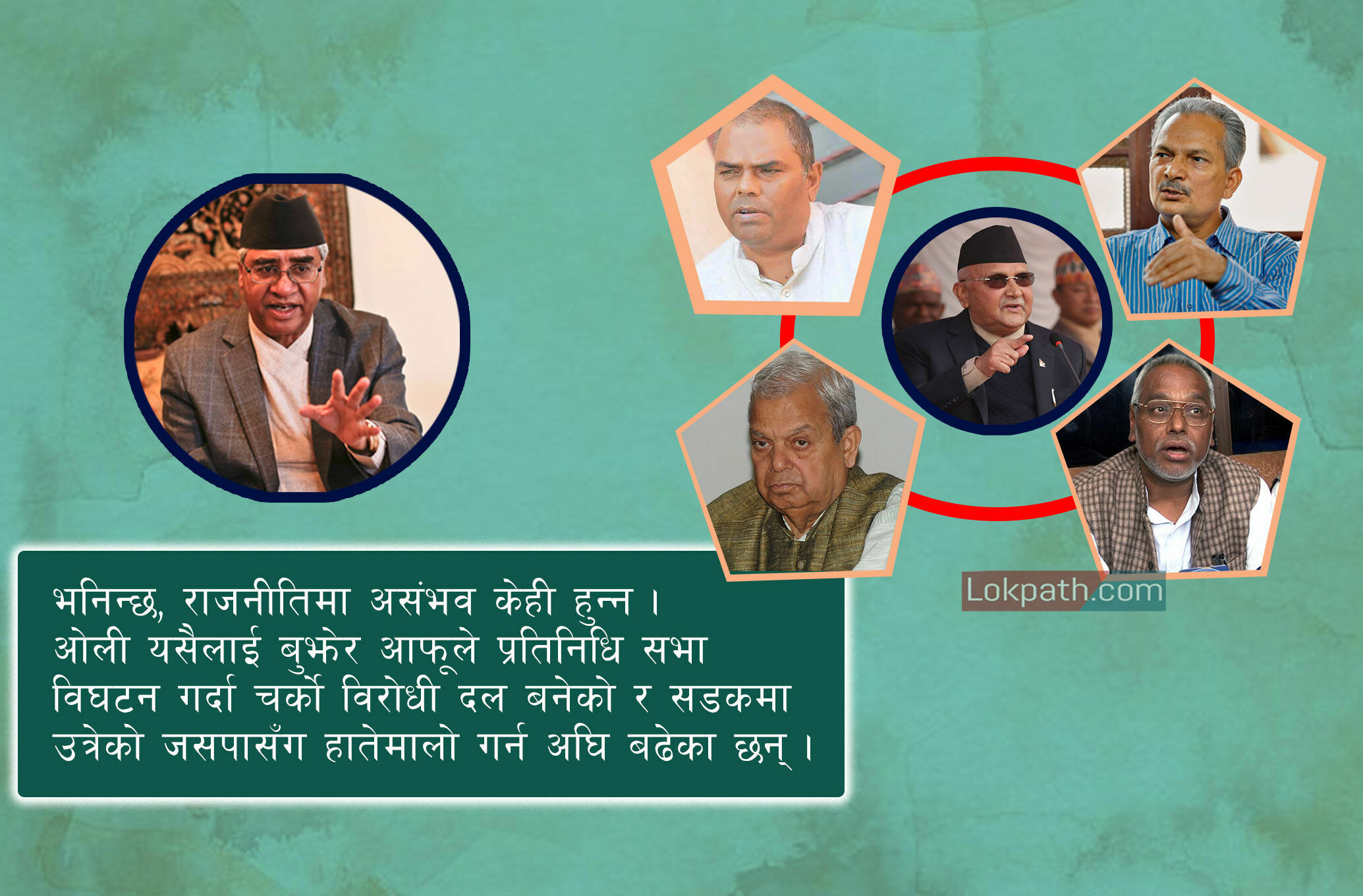 ओली भरिसक्य सिँङ्गै जसपा नभए उसलाई फुटाएर पूर्व राजपा पक्षधरलाई लिएर सरकार जोगाउने बाटोमा छन् । उता नेपाली कांग्रेस सत्ताका लागि हतार नगर्ने तर माओवादी र जसपाले विश्वसनीय वातावरण बनाएमा सरकारमा जाने दाउमा छ ।