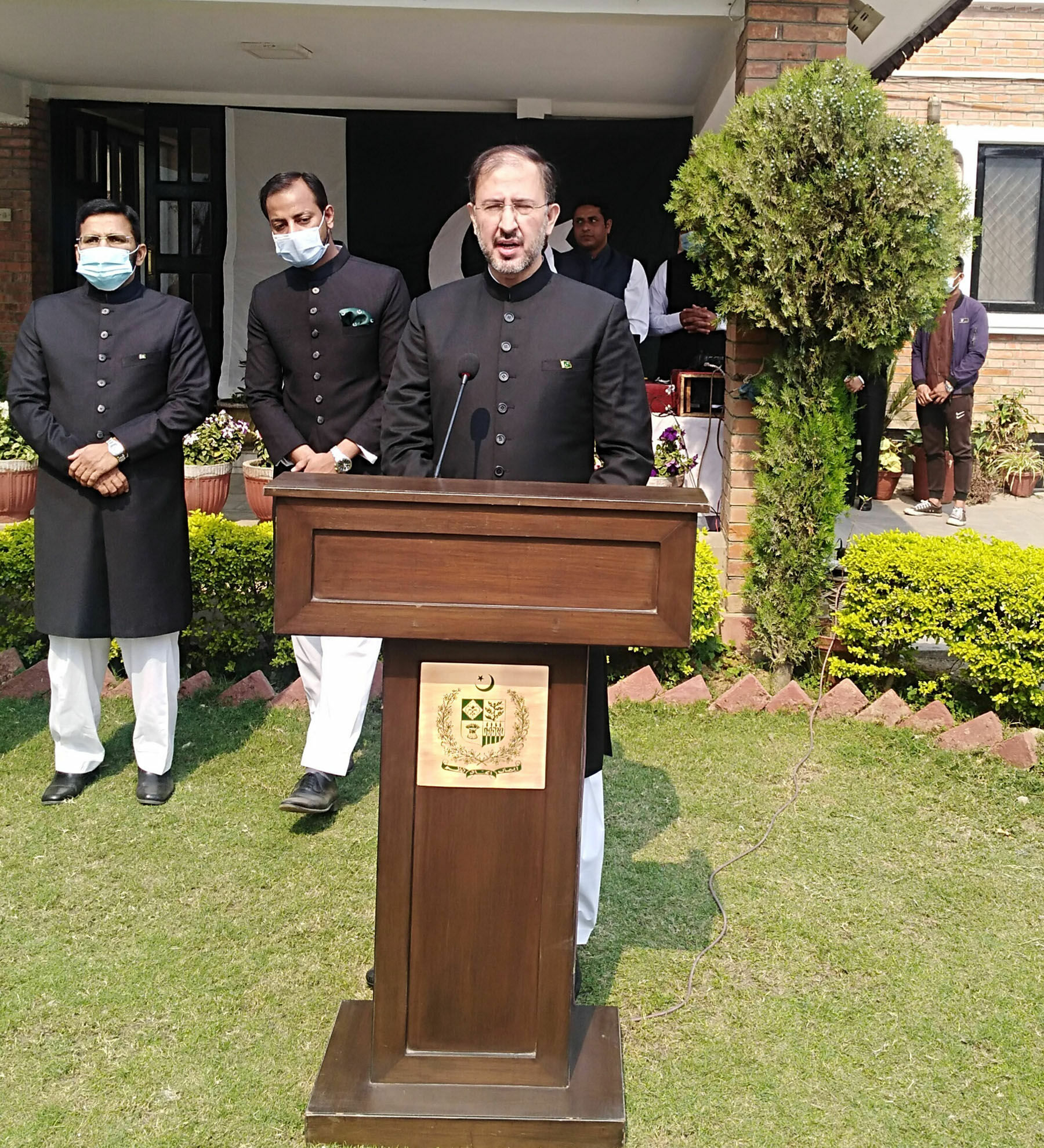 आफ्नो राष्ट्रको झण्डोत्तोलन गर्दै यहाँस्थित पाकिस्तानी राजदूत सयद हैदर शाहले आफ्ना पूर्वजले परिकल्पना गरेको पाकिस्तान निर्माण गर्न सबै पाकिस्तानीले आफ्नो प्रतिबद्धताको पुनर्पुष्टि गर्नुपर्नेमा जोड दिए ।