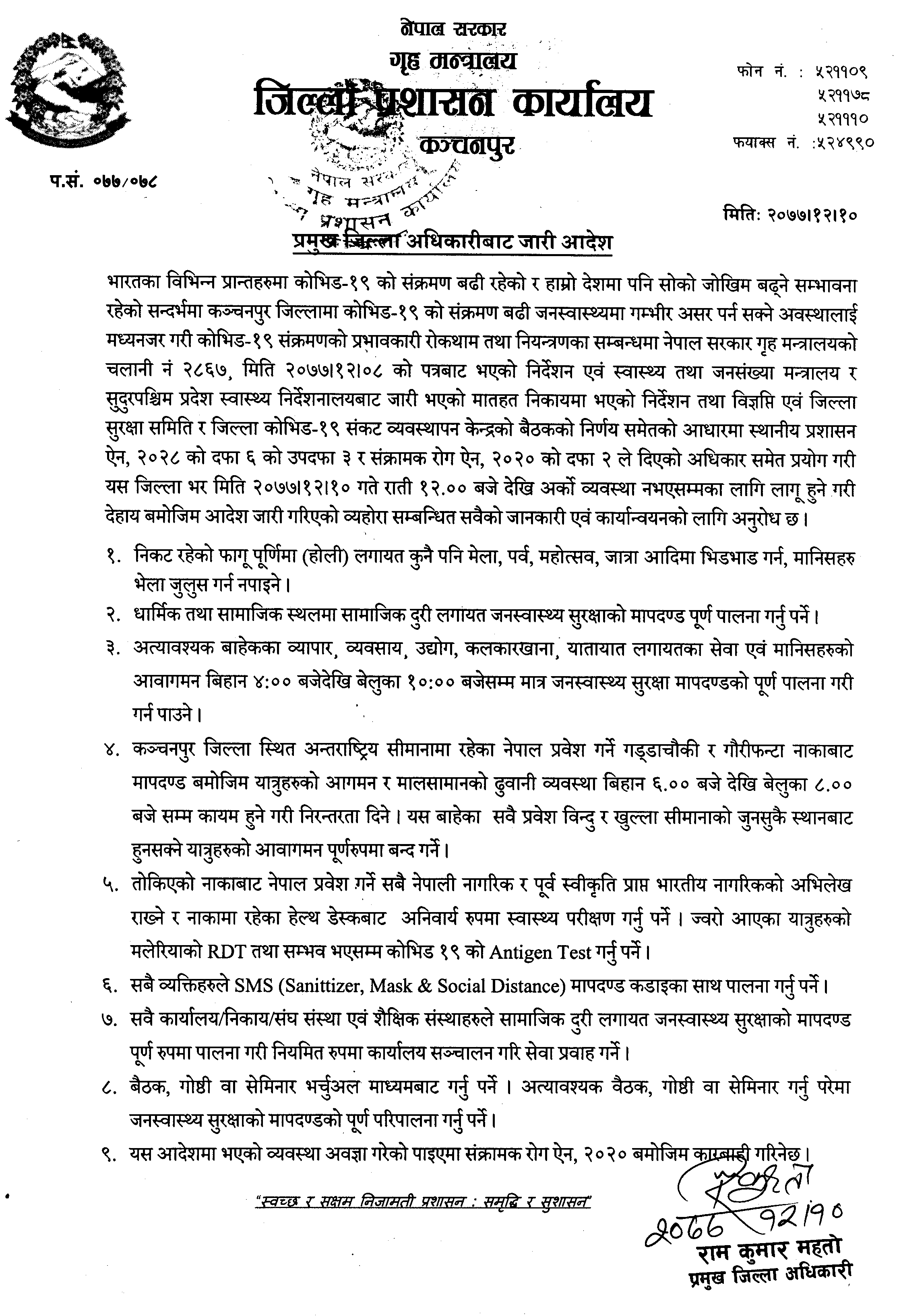 कञ्चनपुर जिल्लास्थित अन्तर्राष्ट्रिय सीमा नाका रहेकाले नेपाल प्रवेश गर्ने गड्डाचौकी र गौरीफन्टाबाट मापदण्ड बमाजेजिम यात्रुहरुको आगमान र मालसामानको ढुवानी व्यवस्था बिहान ६ देखि बेलुका ८ बजेसम्म कायम हुने गरी निरन्तरता दिइने भएको जनाइएको छ।