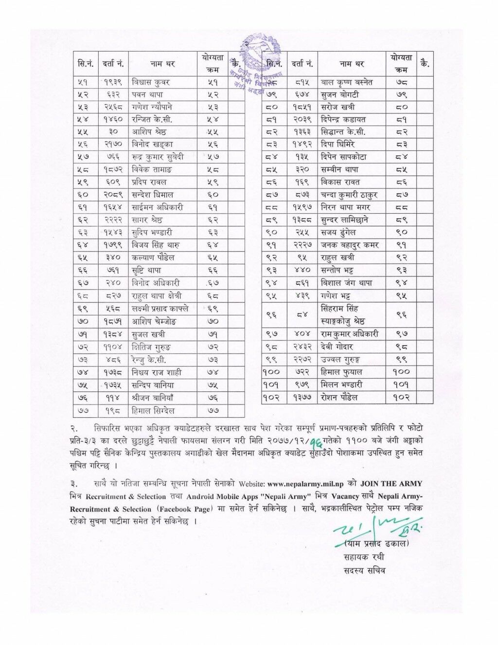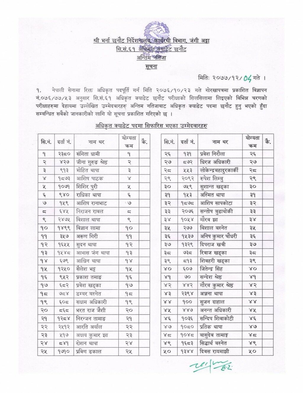 सेनाको पदपूर्तिका लागि २०७६ माघ २३ गते विज्ञापन आह्वान गरेको थियो । सैनिक जनसम्पर्क निर्देशनालयका अनुसार अधिकृत क्याडेट छनौट परीक्षाको सिलसिलामा लिईएको विभिन्न चरणको परीक्षाहरुमा एक सय दुई जना उम्मेवारले अन्तिम नतिजाबाट अधिकृत क्याडेट पदममा छनौट भएका थिए।