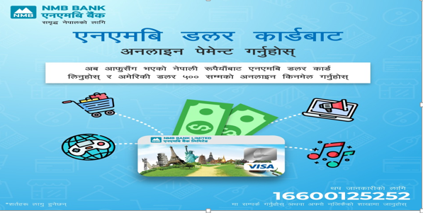 अब एनएमबि बैंकमा आफ्नो प्यान कार्ड र नागरिकता सहित खाता खोली विदेशबाट पाइने सुविधाहरु जस्तै अनलाइन प्रवाह हुने सेवाहरु (भारतमा बाहेक) जस्तै नेटफ्लिक्स, सपिङ्ग, शिक्षा लगायत आफ्नै कार्ड प्रयोग गरी सामाजिक सञ्जाल मार्फत आफ्नो व्यवसायलाई आफैले भुक्तान गरी तत्कालै प्रवद्र्धन गर्न सकिने बैंकले जानकारी दिएको छ ।