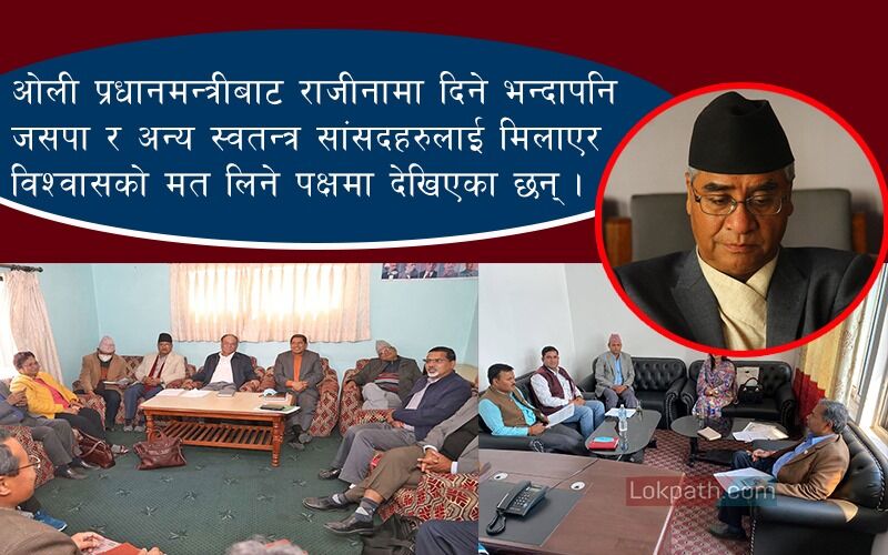 त्यसो त माओवादी केन्द्र र जसपाले देउवालाई भेटेर सत्ता समीकरणका लागि छलफल नगरेका होइनन् । देउवा सरकार बनाउने भन्दापनि ओलीलाई सपोर्ट गर्दै चुनावमा जाने मनस्थितिमा देखिएका कारण अन्य दलहरु पनि कांग्रेसको आधिकारिक धारणा पर्खिरहेका छन् । बिहान साँझ गोप्य र अनौपचारिक छलफलमा व्यस्त भएपनि कांग्रेसकै कारण जसपा र माओवादी केन्द्रको आन्तरिक छलफलहरु निष्कर्षविहिन बनेका छन् ।