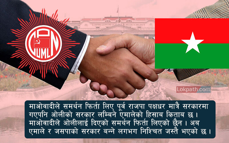 सर्वाेच्च अदालतले गत पुष ५ गते प्रधानमन्त्री केपी शर्मा ओलीले गरेको प्रतिनिधि सभा विघटनको कदम असंवैधानिक भनेर पुनः स्थापना गरिदिएपछि र सर्वाेच्चकै गत फागुन २३ गतेको फैसलाले नेकपा एमाले र माओवादी केन्द्रलाई पूर्ववत् रुपमा व्यूँताइदिएपछि सत्ता समीकरणका लागि प्रयास भइरहेका छन । तर ओलीको विकल्पमा कांग्रेस,जसपा र माओवादीको सरकार बन्ने हुँदा पनि कांग्रेसले पहल नगरेपछि तीन दल एकले अर्काेलाई हेरेर बसेको अवस्थामा ओली भने माओवादीले समर्थन फिर्ता लिएमा आफ्नो सत्तालाई जोगाइराख्ने उद्देश्यले जसपालाई फकाइरहेका छन । नेकपा एमालेका नेताहरु सत्ता समीकरणका लागि जसपासंग पनि खासगरी पूर्व राजपा(राष्ट्रिय जनता पार्टी) पक्षसंग सहमति नजिक पुगेको दाबी गर्छन । माओवादीले समर्थन फिर्ता लिए पूर्व राजपा पक्षधर मात्रै सरकारमा गएपनि ओलीको सरकार लम्बिने एमालेको हिसाव किताव छ । जसपाभित्र पूर्व संघीय समाजवादी फोरम पक्ष भने ओलीसंग कुनै पनि हालतमा सत्ता समीकरण गर्नु हुँदैन भन्ने पक्षमा छ । तर माओवादीले ओलीलाई दिएको समर्थन फिर्ता लिएको छैन । अव एमाले र जसपाको सरकार बन्ने लगभग निश्चित जस्तै भएको छ ।