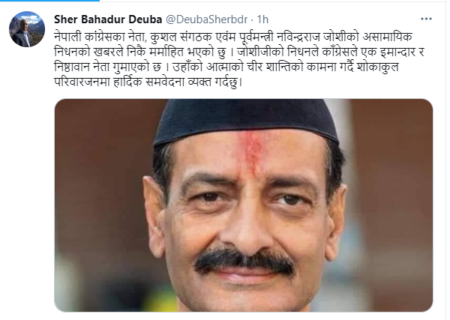 शुक्रवार भएको जोशीको निधनप्रति दुख व्यक्त गर्दै देउवाले सामाजिक सञ्जाल ट्वीटरमा भावुक ट्वीट गरेका हुन् ।