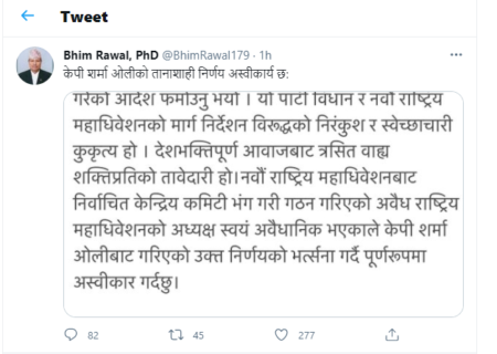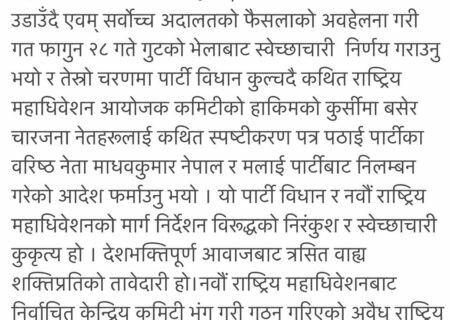 यो पार्टी विधान र नवौं राष्ट्रिय महाधिवेशनको मार्ग निर्देशन विरुद्धको निरंकुश र स्वेच्छाचारी कुकृत्य हो । देशभक्तिपूर्ण आवाजबाट त्रसित वाह्य शक्तिप्रतिको तावेदारी हो। नवौं राष्ट्रिय महाधिवेशनबाट निर्वाचित केन्द्रिय कमिटी भंग गरी गठन गरिएको अवैध राष्ट्रिय महाधिवेशनको अध्यक्ष स्वयं अवैधानिक भएकाले केपी शर्मा ओलीबाट गरिएको उक्त निर्णयको भत्र्सना गर्दै पूर्णरूपमा अस्वीकार गर्दछु।