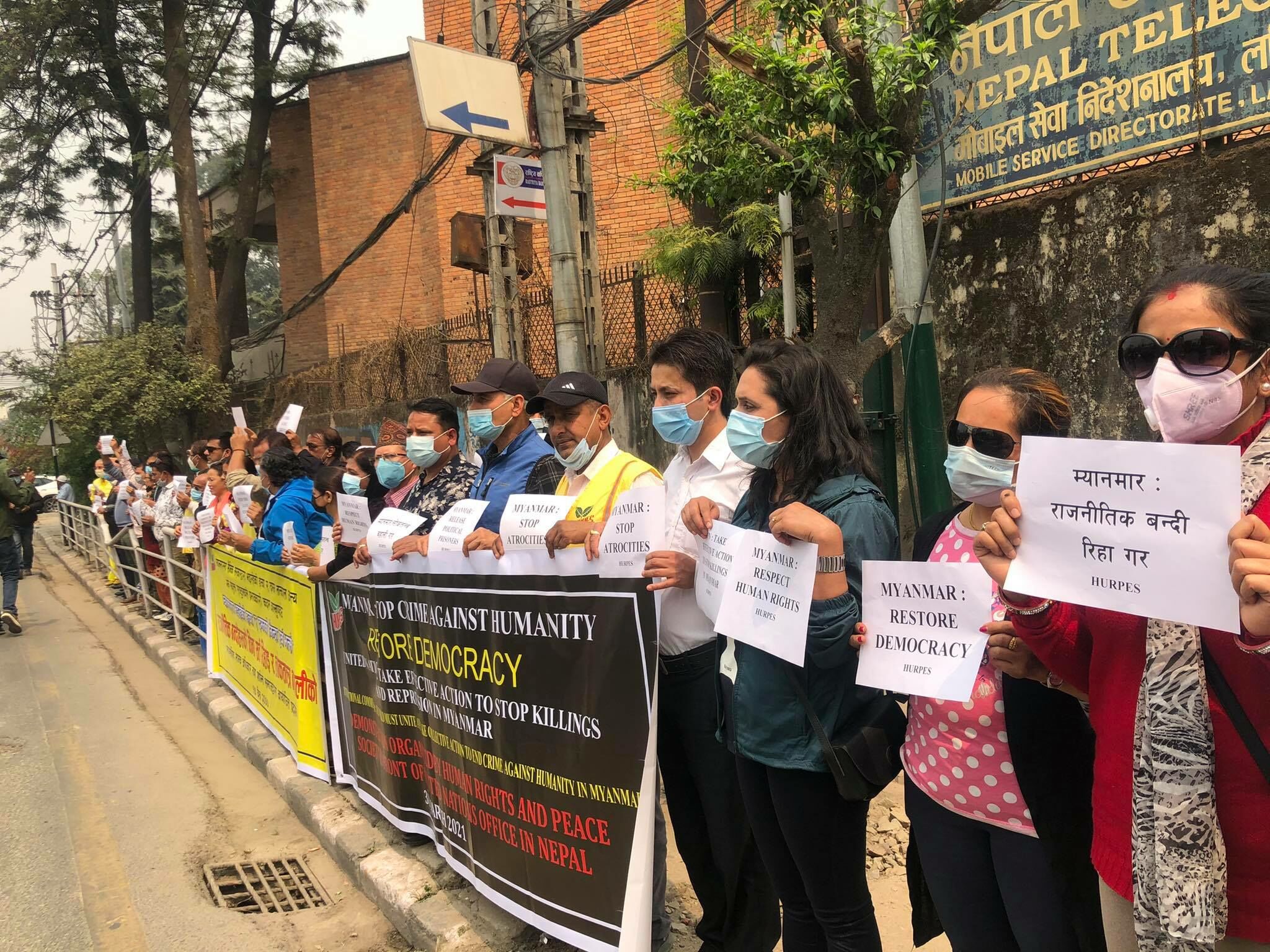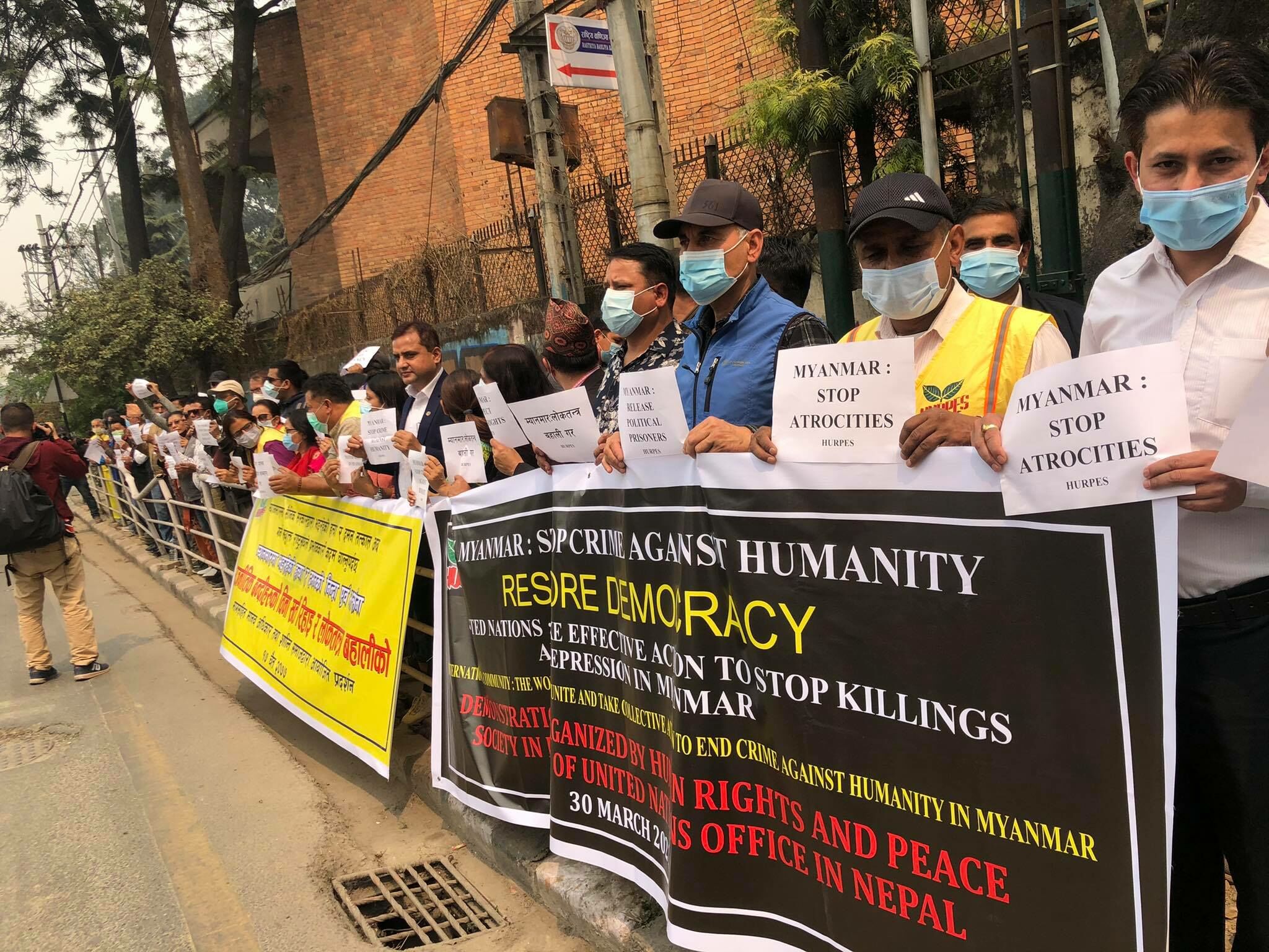 यू एन हाउस पुल्चोक अगाडि दिउँसो भएको प्रदर्शनमा, म्यानमारमा भइरहेको हत्या र दमन रोक्न प्रभावकारी कदम चाल्न संयुक्त राष्ट्रसंघलाई र म्यानमारमा भइरहेको मानवता विरुद्धको अपराधलाई अन्त्य गर्न समस्त विश्व एक भएर सामूहिक कदम चाल्न आग्रह गरिएको थियो ।