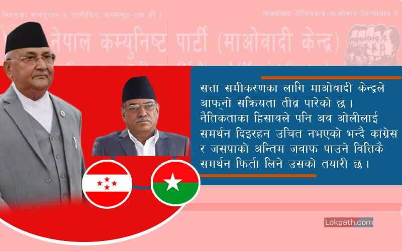 सत्ता समीकरणका विषयमा कांग्रेस, माओवादी केन्द्र र जसपाले एक अर्कालाई ‘पर्ख र हेर’ को अवस्था रहेकै अवस्थामा माओवादी केन्द्रले समीकरणका लागि आफ्नो सक्रियता देखाउन थालेको छ। नैतिकताका हिसाबले पनि ओलीलाई समर्थन दिइरहन माओवादीका लागि पनि सम्भव छैन । यही कारण हुन सक्छ,एक माओवादी नेता भन्दै थिए,‘केही दिनमै समर्थन फिर्ता लिइने छ ।’