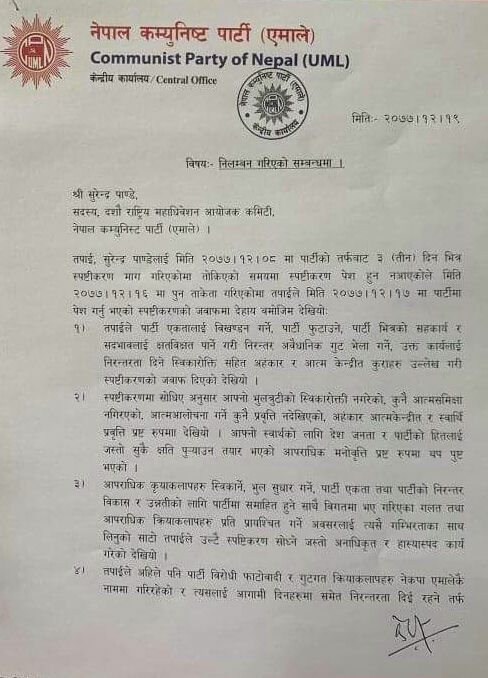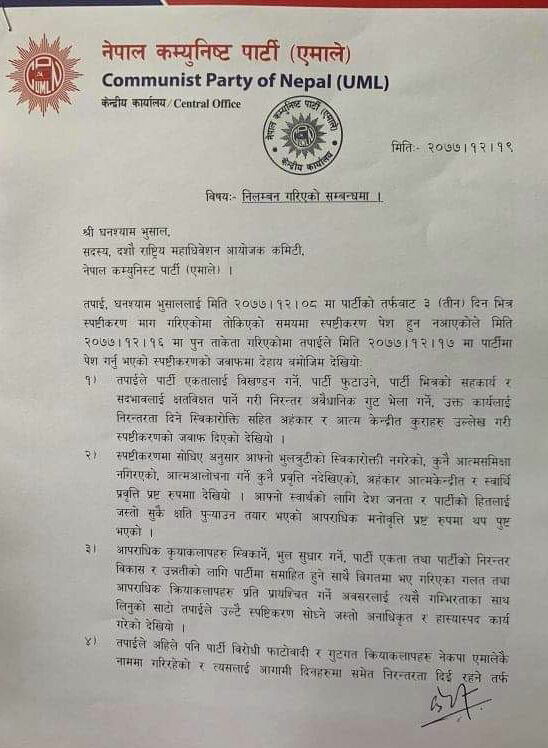पार्टीको विधानविपरित काम गरेको भन्दै गत चैत ८ गते स्पष्टीकरण सोधिएको थियो । तर चित्त बुझ्दो जवाफ नआएको भन्दै नेताद्वय पाण्डे र भुसाललाई निलम्बन गरिएको हो । पाण्डे र भुसालसँगै वरिष्ठ नेता माधवकुमार नेपाल, भीम रावलसहित ४ जना नेताहरुलाई स्पष्टीकरण सोधिएको थियो । यसअघि चित्त बुझ्दो जवाफ नआएको भन्दै नेताद्वय नेपाल र रावललाई समेत पार्टीबाट निलम्बन गरिएको छ ।