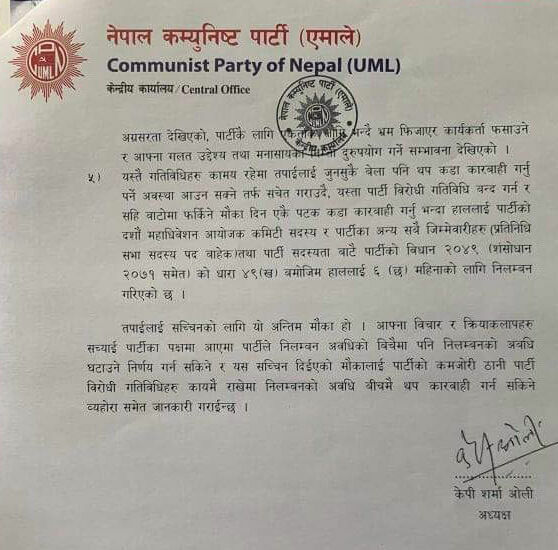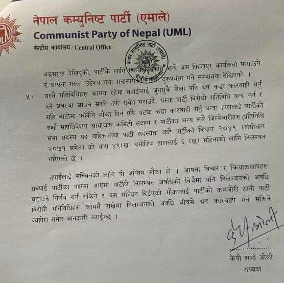 आज एक पत्र लेख्दै प्रधानमन्त्री समेत रहेका अध्यक्ष ओलीले स्पष्टीकरणमा सोधिएको भुलसुधारको स्वीकारोक्ती नगरेको, कुनै आत्मसमिक्षा नगरिएको, आत्मआलोचना गर्ने प्रवृती नभएको भन्दै ६ महिनाको लागि निलम्बन गरिएको बताइएको छ ।