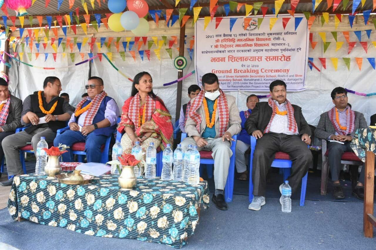 राष्ट्रिय पुनर्निर्माण प्राधिकरणका सचिव मणिराम गेलाल, भारतीय राजदूतावासको राजनीतिक प्रभागकी प्रथम सचिव सौम्या सी र रोशी गाउँपालिकाका मेयरको उपस्थितिमा आज काभ्रे जिल्लाको रोशी गाउँपालिकास्थित हरिसिद्धि माध्यमिक विद्यालय र महाभारत गाउँपालिकास्थित श्री सिद्धेश्वर माध्यमिक विद्यालयको पुनर्निर्माणका लागि भूमि पूजा सम्पन्न भएको छ ।