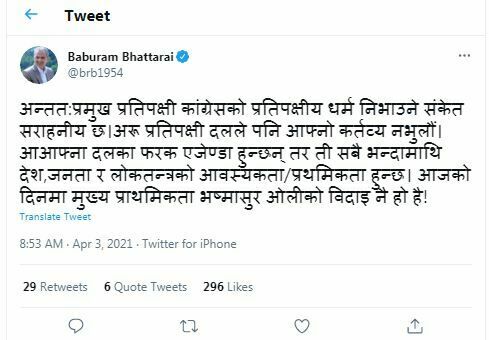काठमाडौं । जनता समाजवादी पार्टीका नेता एंव पूर्वप्रधानमन्त्री डा.बाबुराम भट्टराईले प्रधानमनत्री केपी शर्मा ओलीलाई भष्मासुरको संज्ञा दिएका छन्। प्रमुख विपक्षी नेपाली कांग्रेसले प्रतिपक्षीय धर्म निभाउने संकेत गरेकोमा सराहना गर्दै डा. नेता भट्टराईले अहिलेको मुख्य प्राथमिकता भष्मासुर ओलीको विदाइ नै रहेको ट्वीटमा उल्लेख गरेको छ । नेता भट्टराईले आफ्नो सामाजिक सञ्जाल यस्तो लेख्नुभएको छ ।