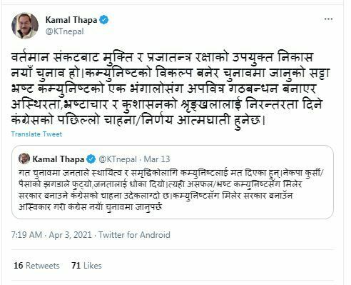 अपवित्र गठबन्धन बनाएर कुशासनको निरन्तता दिने कांग्रेसको चाहना आत्मघाती हुने उनले गरेको छ । त्यसैगरी उनले अहिलेको संकटको निकास नयाँ चुनाव भएको ठोकुवा समेत गरे । साथै अध्यक्ष थापाले सामाजिक सञ्जाल ट्वीटरमा यस्तो लेखेको छ ।