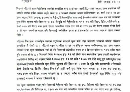 एलपी ग्यास र कवाइ इन्धनको मूल्य खुद्रा बिक्री मूल्य भने हाललाई यथावत राखिएको निगमले जनाएको छ ।
