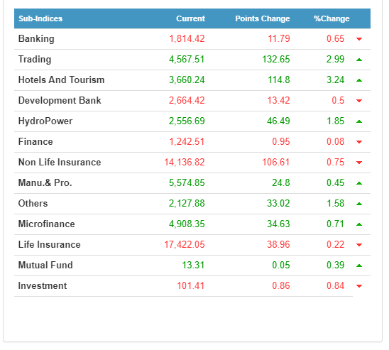सोमवार ट्रेडि, होटल तथा पर्यटन, उत्पादनमुलक संस्था,अन्य ,लघुवित्त वित्तिय संस्था,म्युचुअल फण्ड लगायतको कारोबार बढेको छ भने अन्य उपसमूहहरुको कारोबार घटेको छ ।