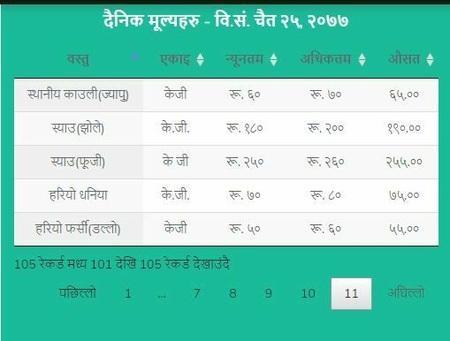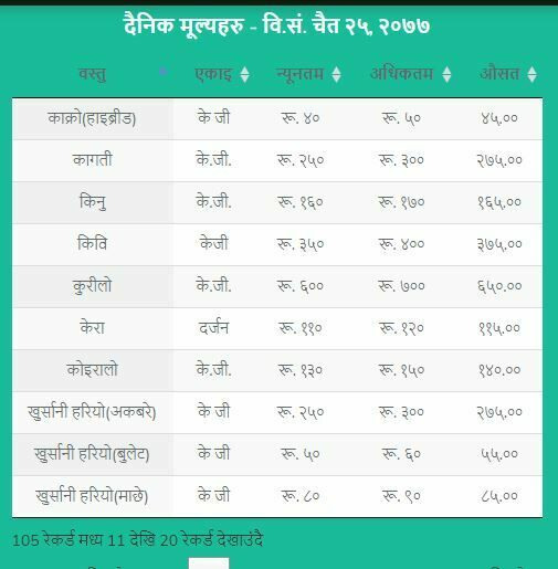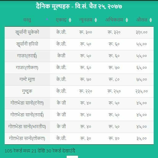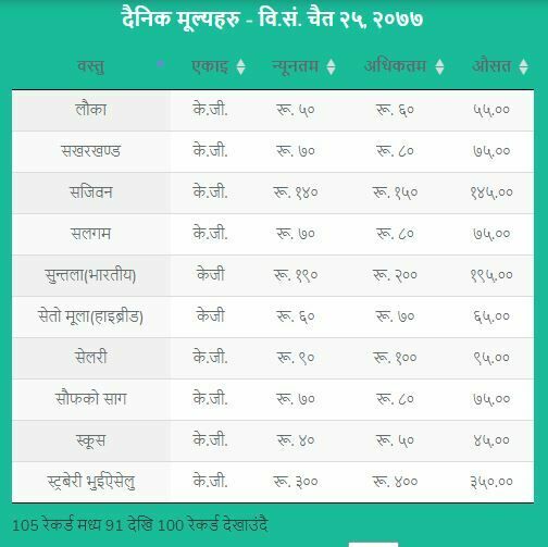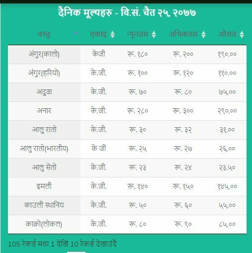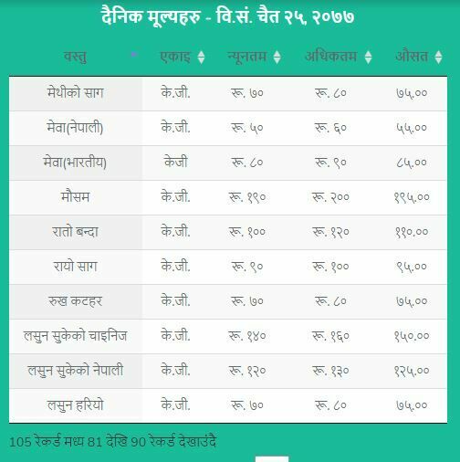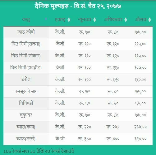 त्यस्तै अंगुर (हरियो) प्रतिकेजी ११० रुपैयाँ, आलु रातो प्रतिकेजी ३१ रुपैयाँ, इमली प्रतिकेजी १४५ रुपैयाँ, काउली (स्थानीय) प्रतिकेजी ५५ रुपैयाँ, हरियो अकबरे खुर्सानी प्रतिकेजी २७५ रुपैयाँ , सुकेको खुर्सानी प्रतिकेजी ३१० रुपैयाँ, घिउ सिमी (लोकल) प्रतिकेजी ११५ रुपैयाँ रहेको समितिले जनाएको छ ।